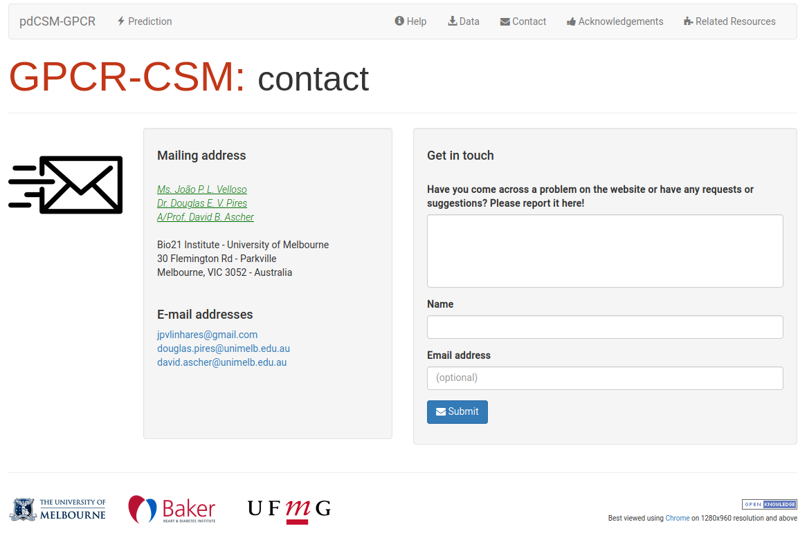 In case you experience any trouble using pdCSM-GPCR or have any suggestions or comments, please do not hesitate in contacting us either via e-mail or through the online form.