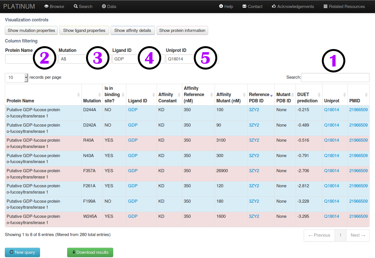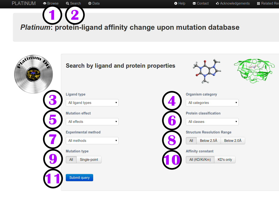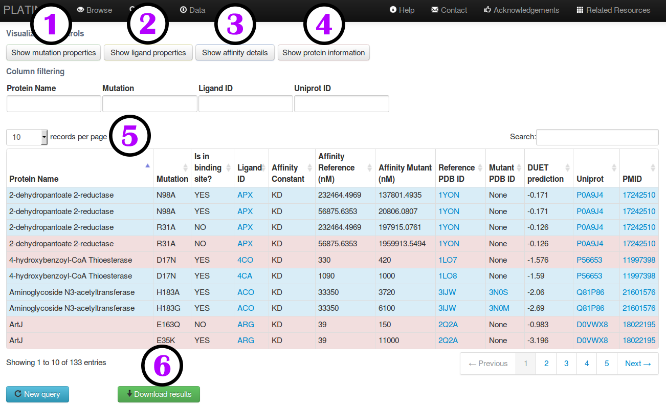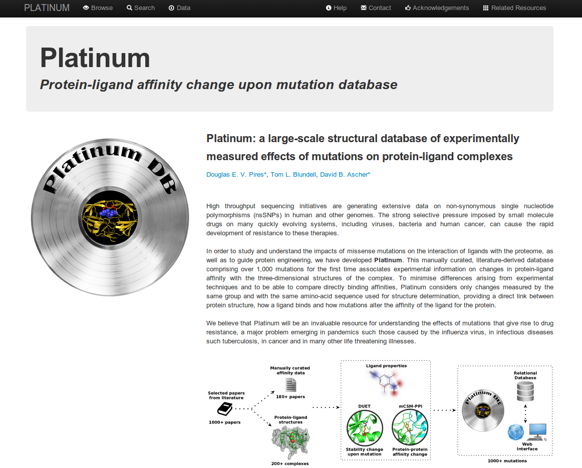 PLATINUM is a manually curated, literature-derived database that associates experimental information on changes in protein-ligand affinity with the three-dimensional structures of the complex. The current version of PLATINUM contains structural and affinity data reflecting the effects of mutations on protein-ligand complexes comprising: