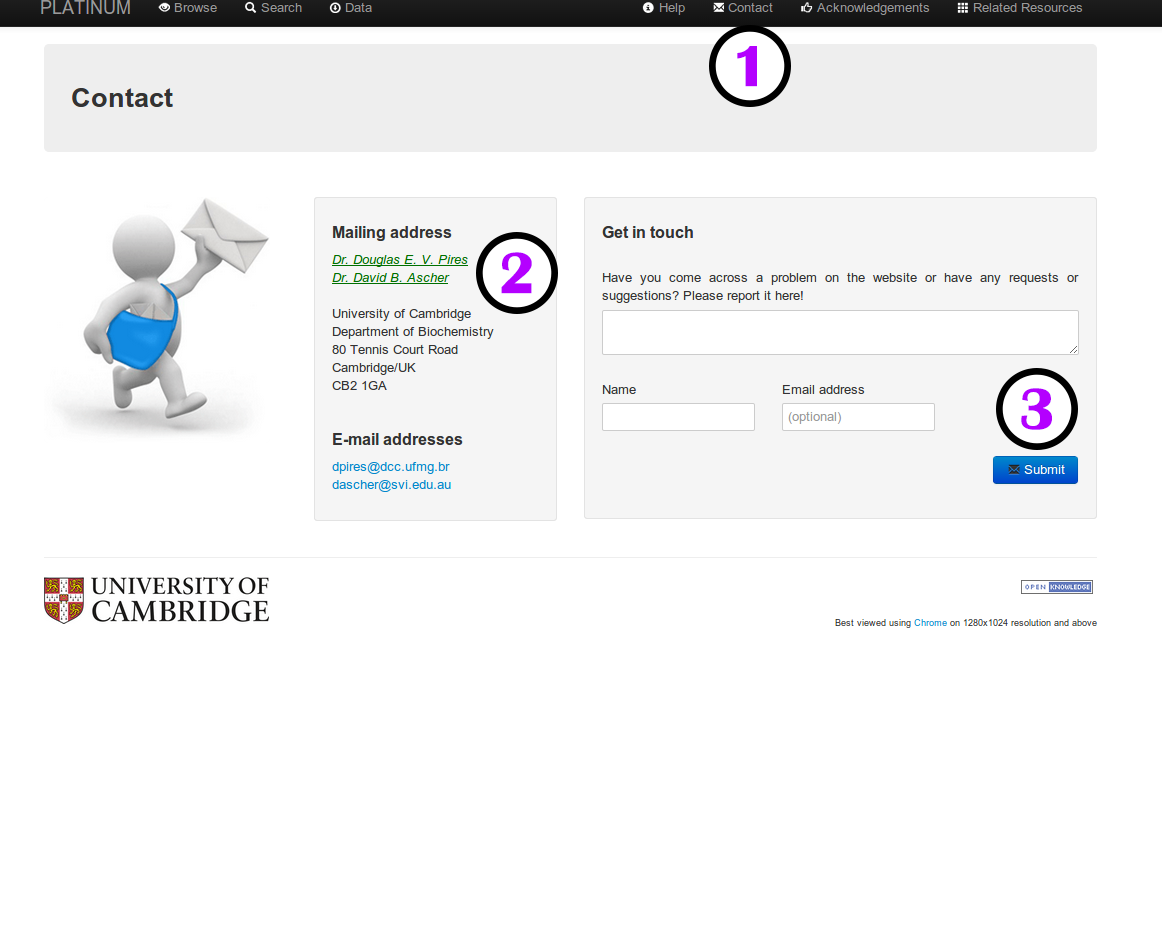 In case you experience any trouble using PLATINUM or have any suggestions or comments, please do not hesitate in contacting us (1) either via e-mail (2) or through the online form (3).
